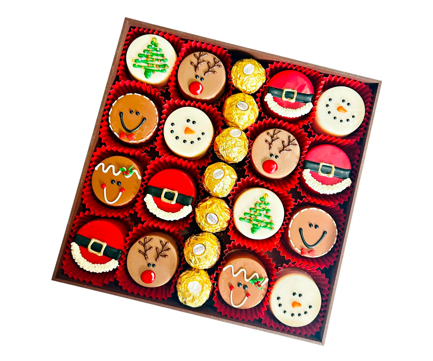 - 16 Galletas oreo cubiertas de chocolate (rojo lacteo, amargo y blanco) decoradas de navidad