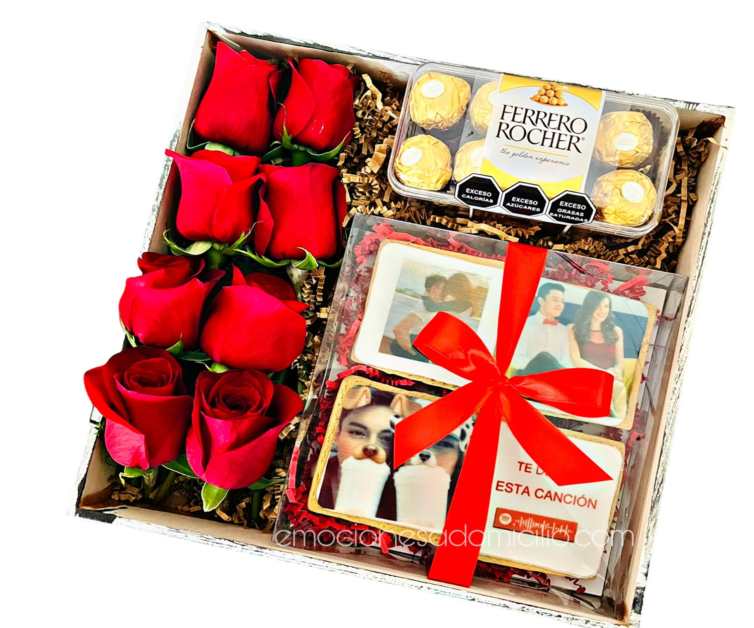 - Caja de acetato con 4 galletas de mantequilla impresas (fotos o tema a elegir) y una escaneable con la canción