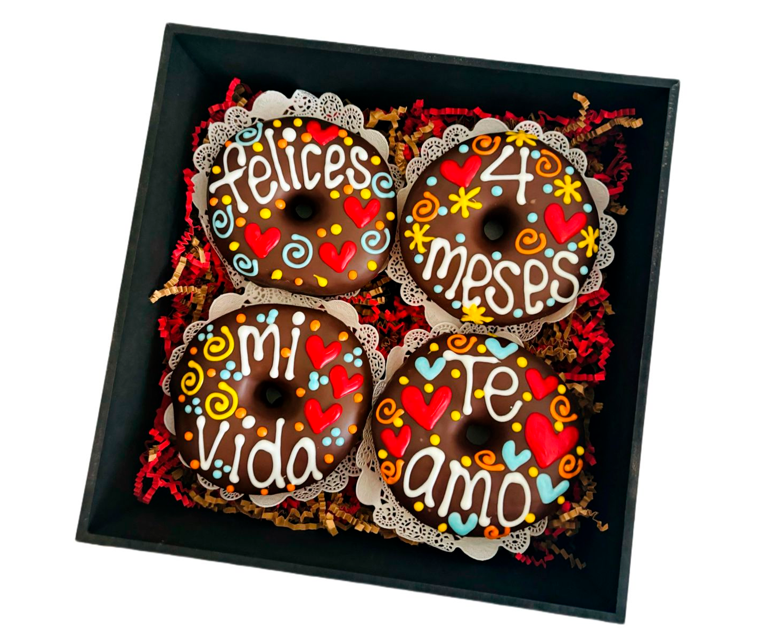 - 4 Donas cubiertas de chocolate con mensaje personalizado (especificar mensaje por WhatsApp o en comentarios)