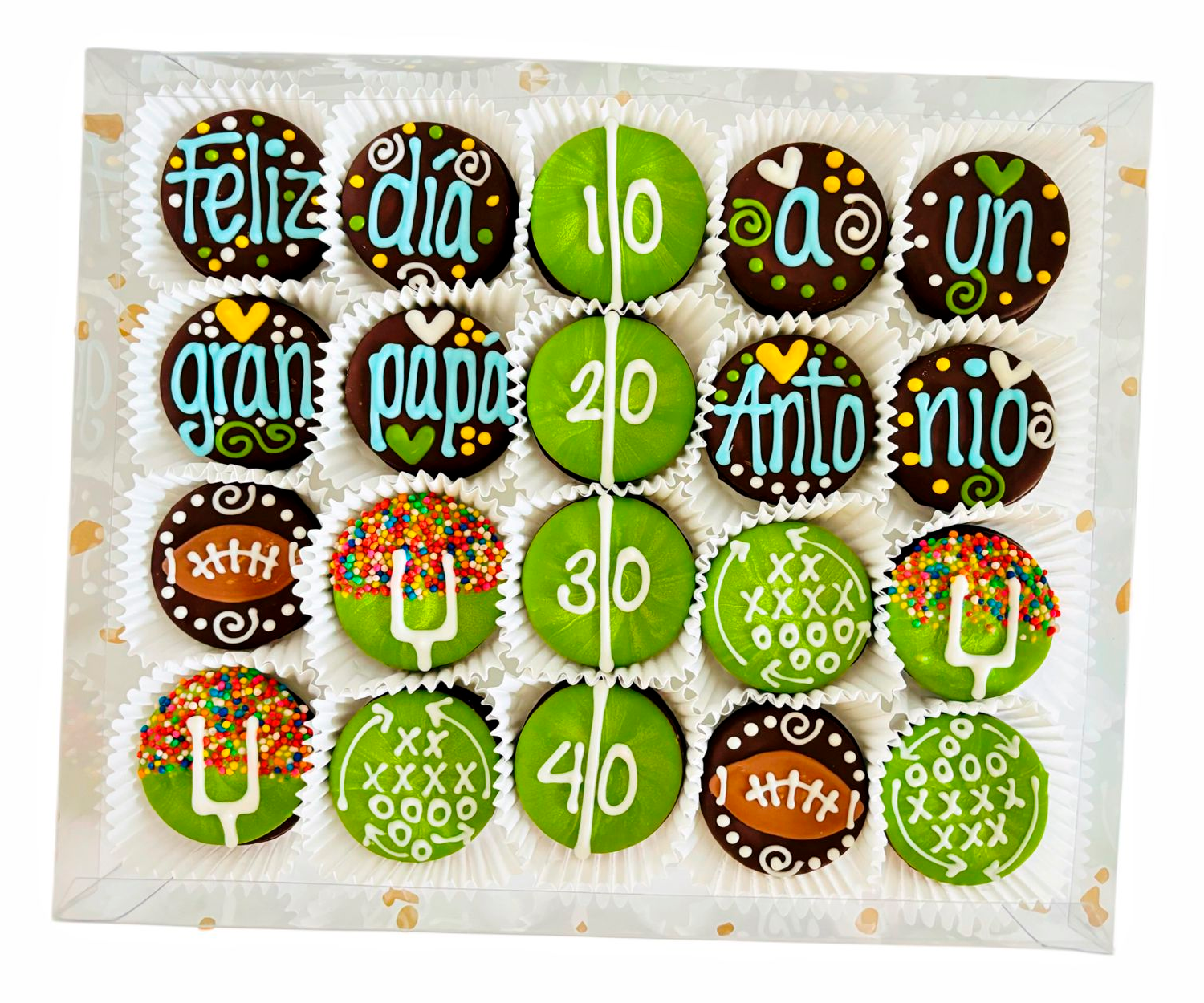 - 16 Galletas de vainilla cubiertas y decoradas con chocolate (mandar frases por WhatsApp y decir si es de soccer o americano)